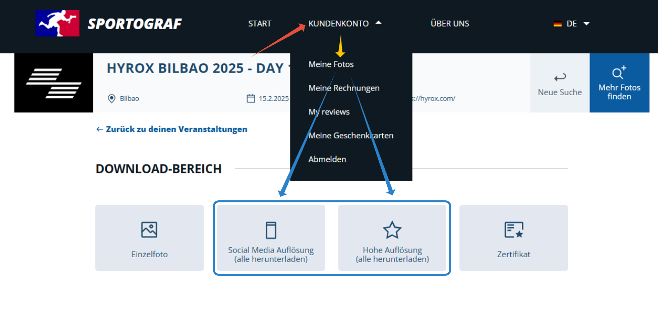 Klicke auf „Kundenkonto“ > „Meine Fotos“ > auf das gewünschte Fotopaket > auf die Auflösung, die Du herunterladen möchtest