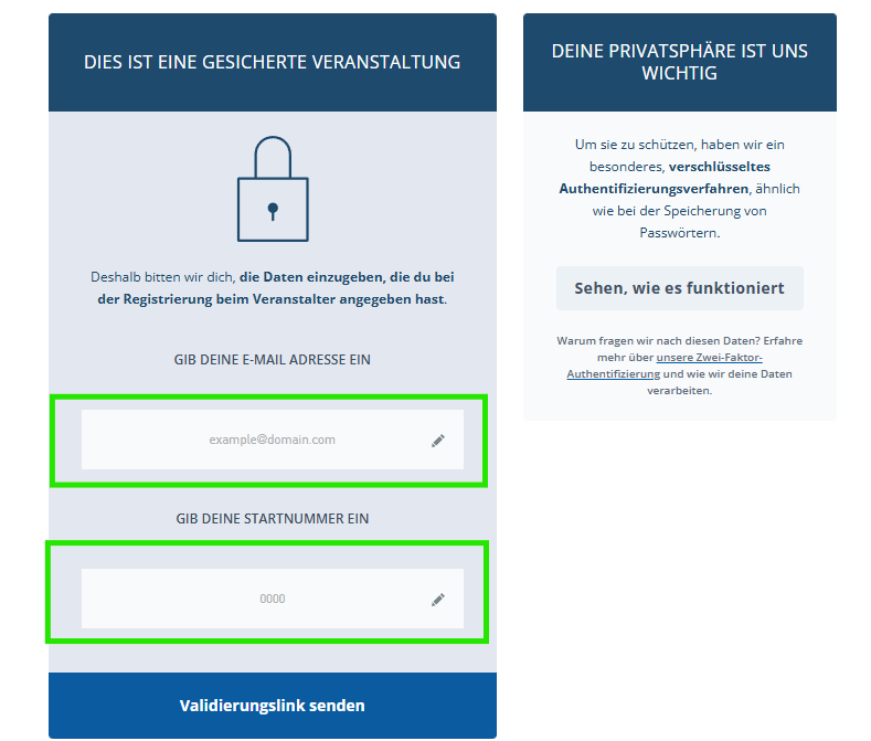 - Gib im Validierungs-Fenster deine Startnummer sowie die exakte E-Mail-Adresse an, die du bei der Anmeldung zum Berliner Halbmarathon oder der Berlin Mile 2026 verwendet hast.