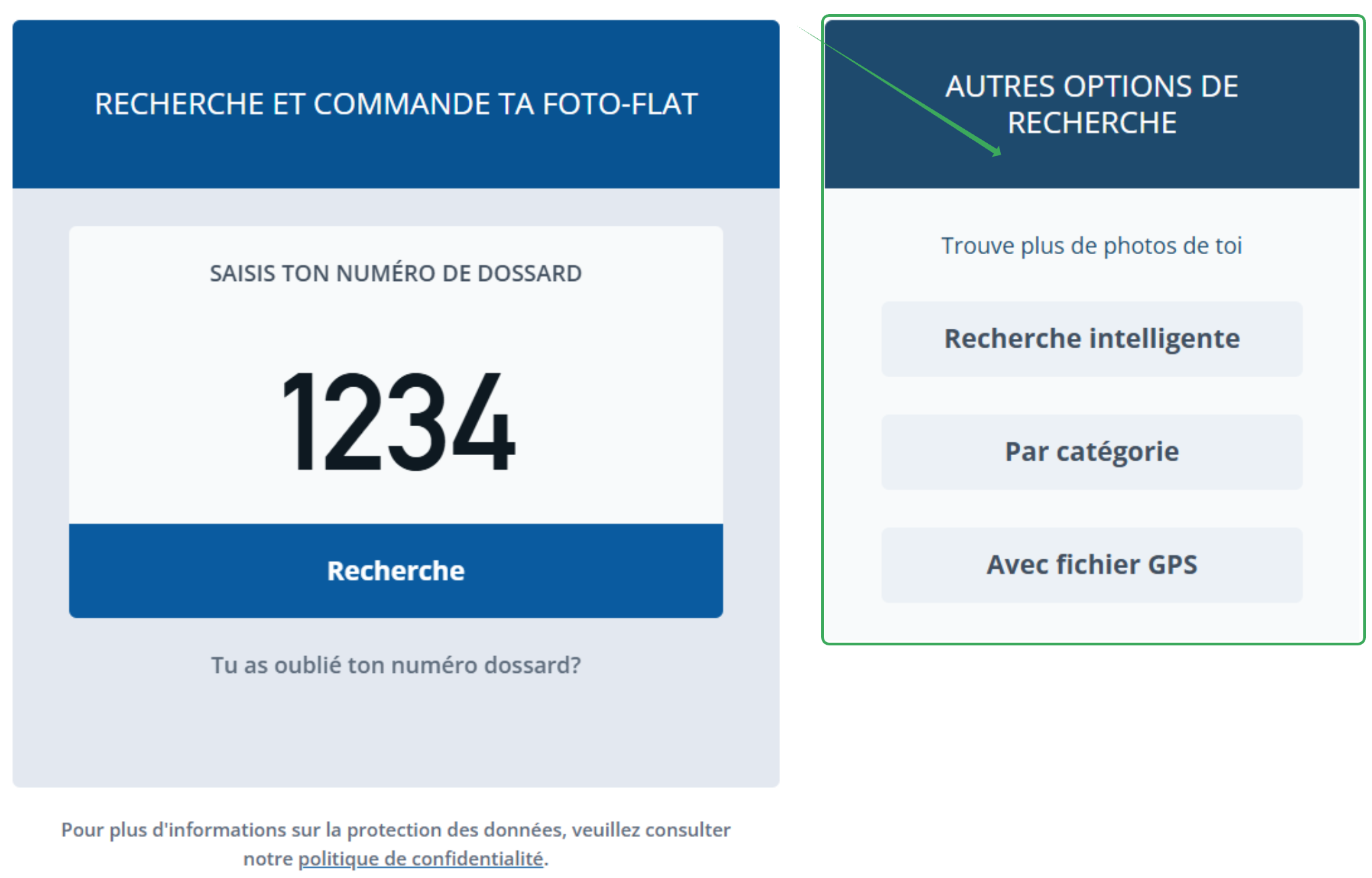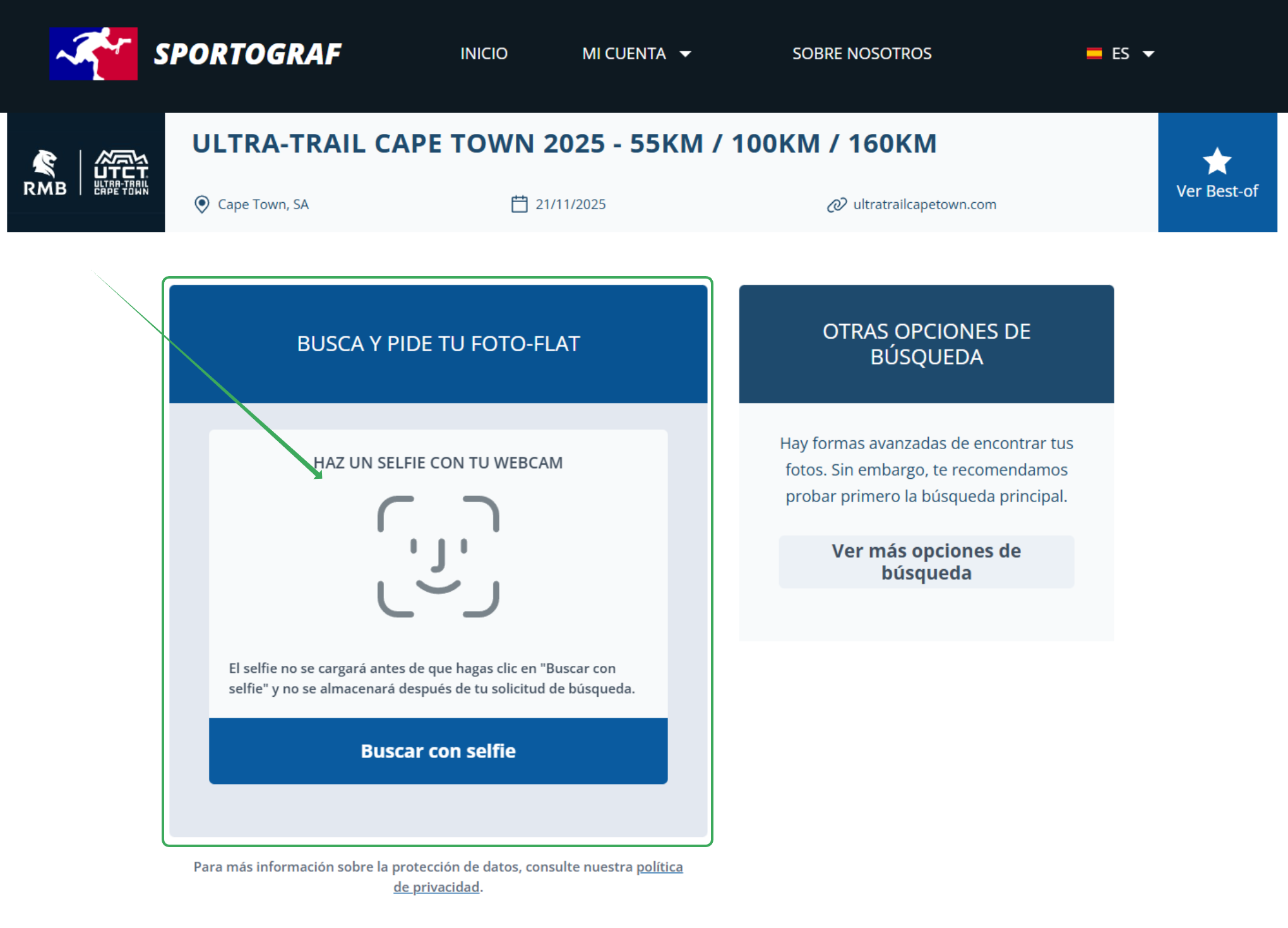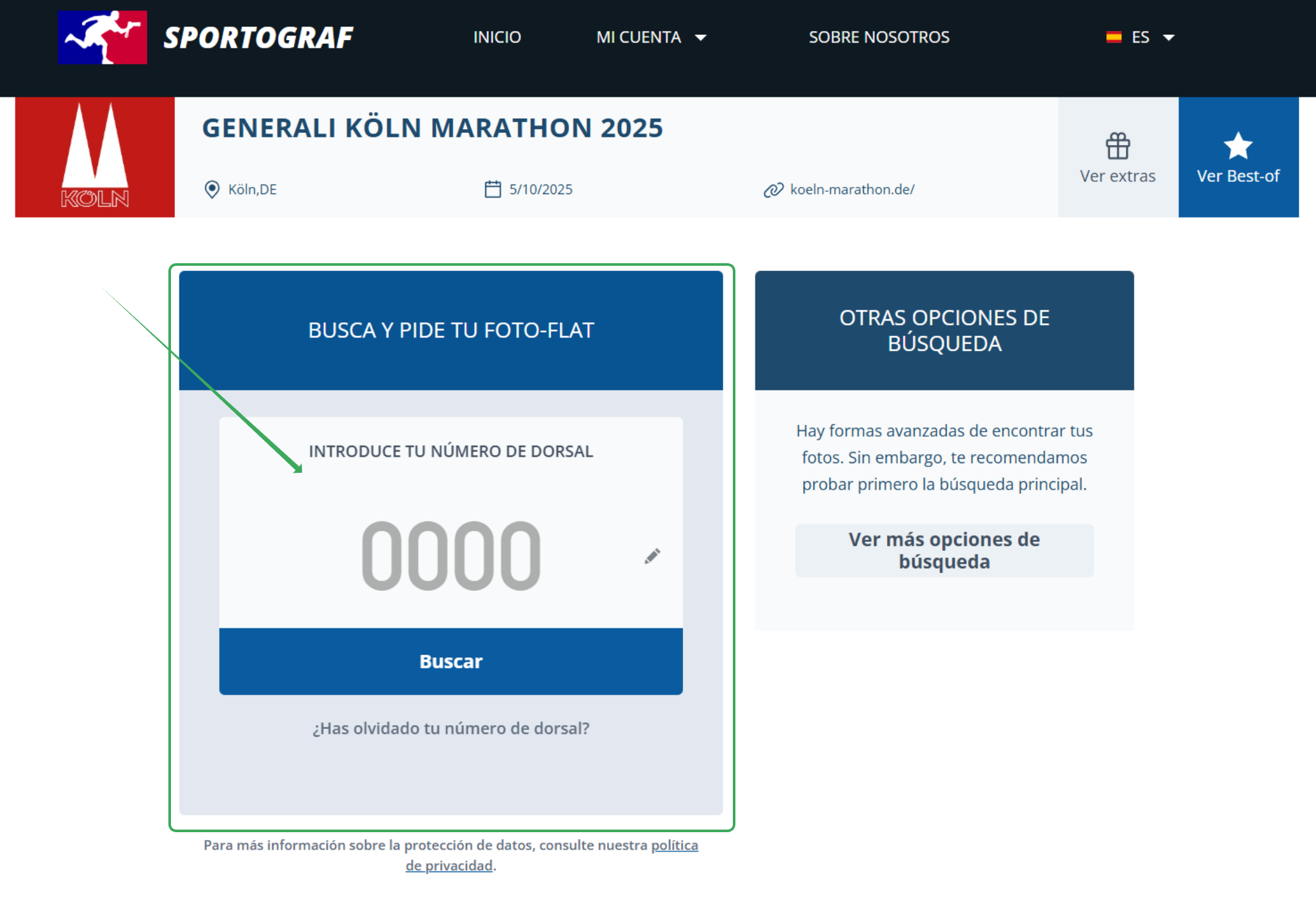 Importante: Para poder comprar tu paquete de fotos, también llamado "Foto-Flat", primero debes completar la búsqueda principal (por ejemplo, búsqueda por selfie o por número de dorsal).