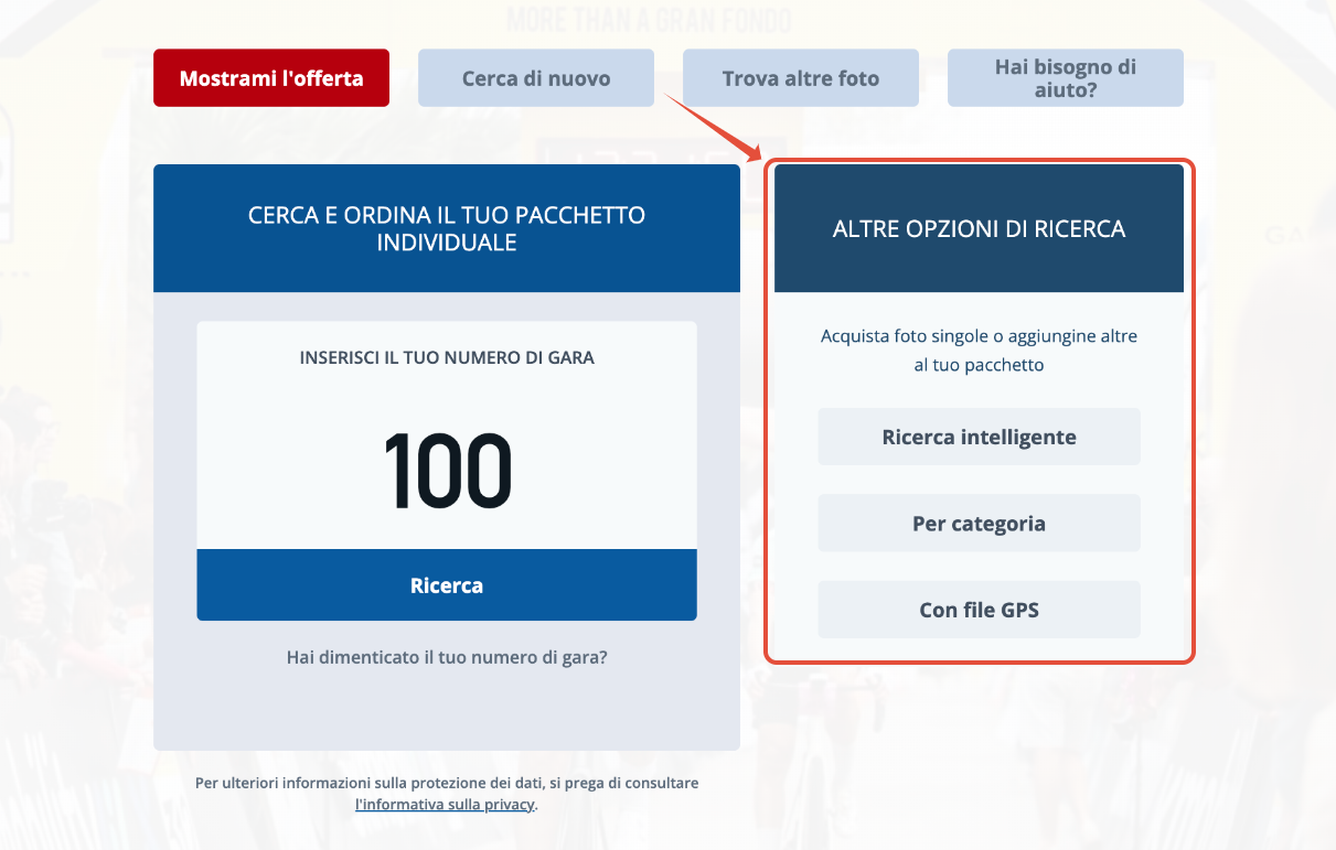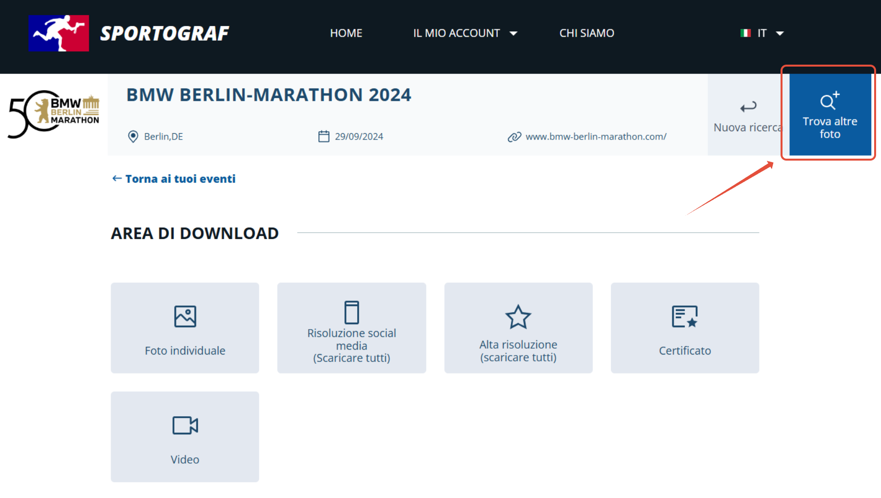Puoi cercare altre foto di te subito dopo la ricerca tramite selfie (o numero di pettorale) usando “Altre opzioni di ricerca” e contrassegnarle con il pulsante “Sono io”.