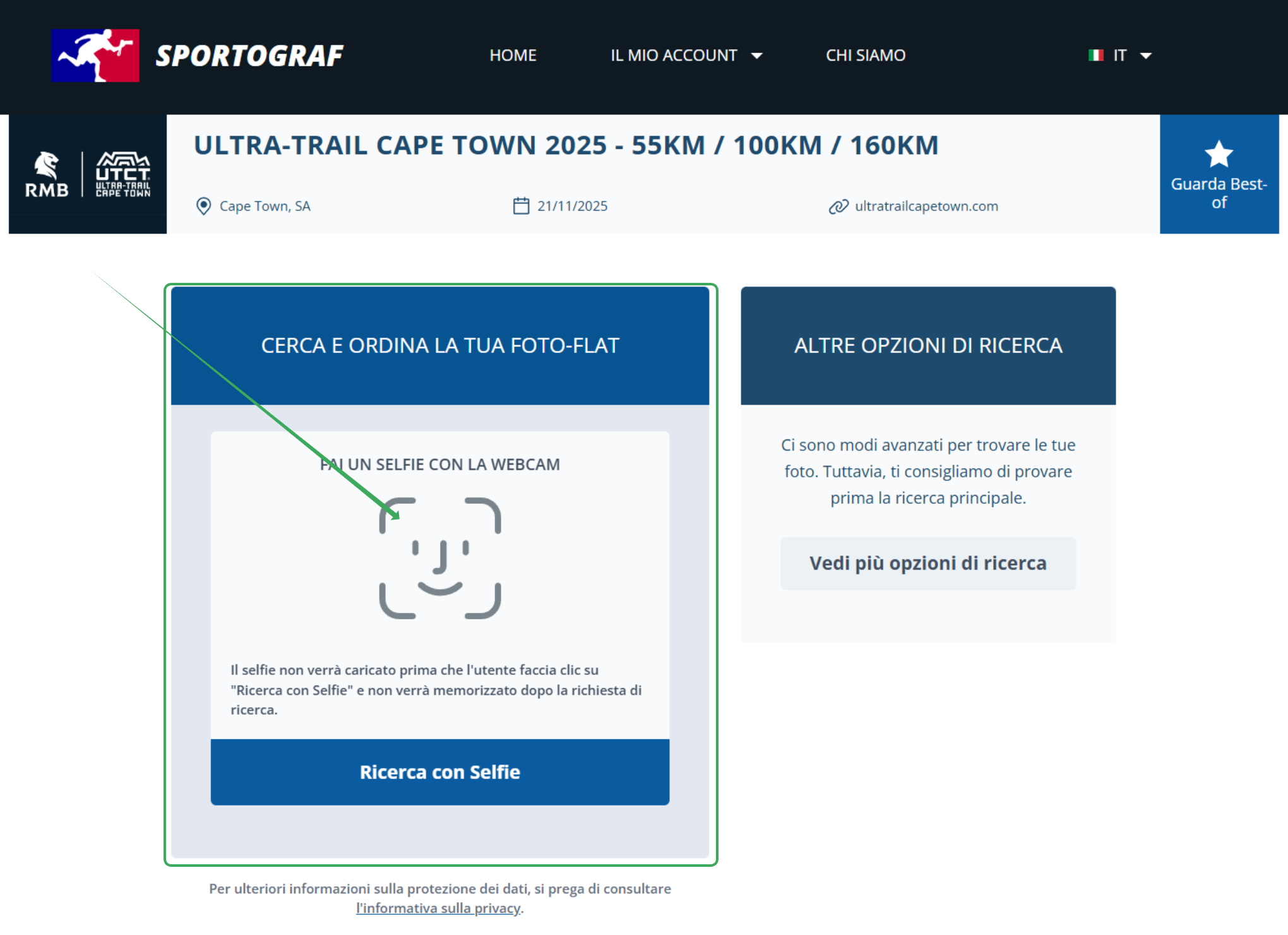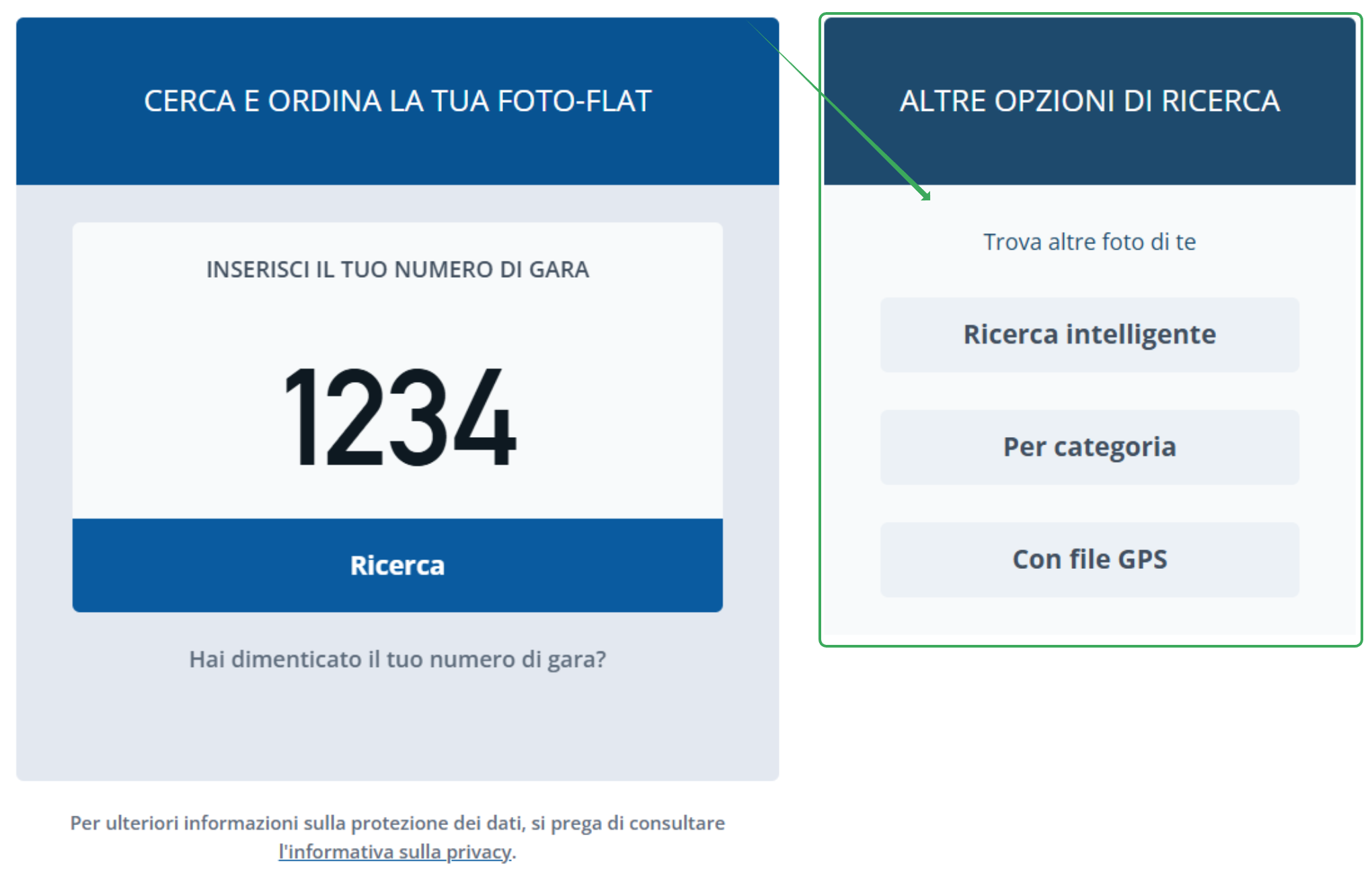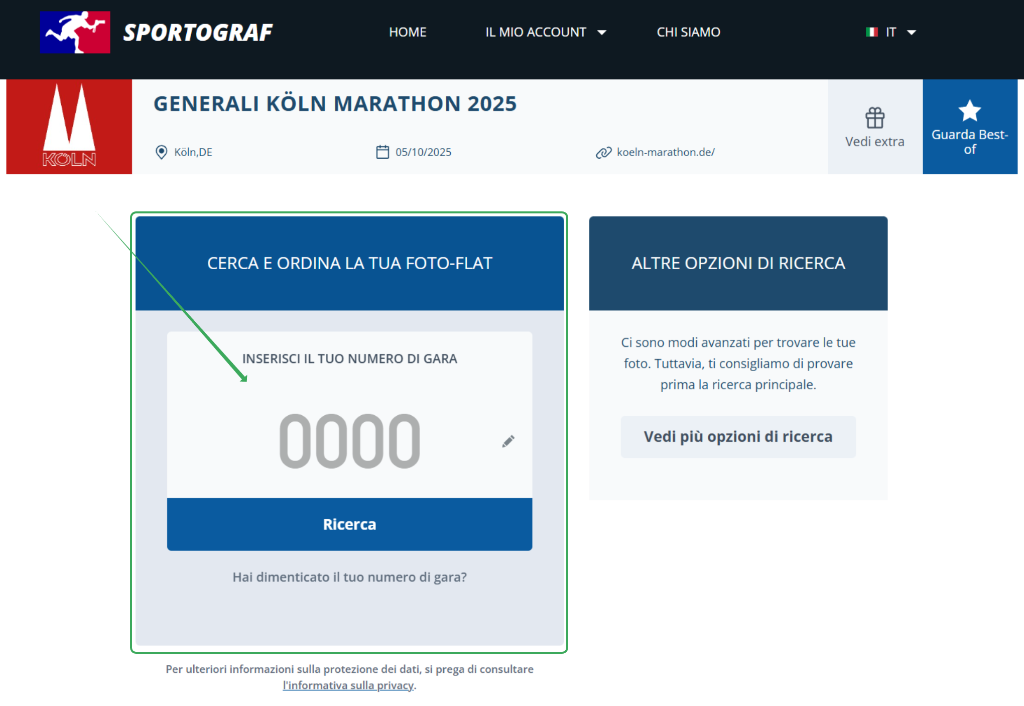 Importante: Per poter acquistare il tuo pacchetto fotografico, chiamato anche "Foto-Flat", devi prima completare la ricerca principale (ad esempio la ricerca tramite selfie o numero di pettorale).